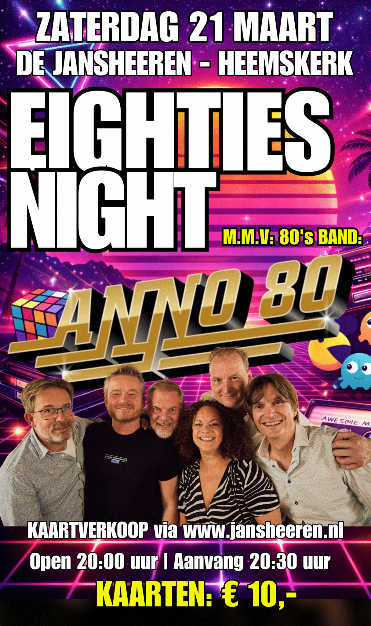 ANNO80 bestaat uit zes ervaren muzikanten die hun sporen ruimschoots hebben verdiend in de muziekwereld. Op zaterdag 21 maart 2026 mogen wij deze supergezellige band verwelkomen in de Jansheeren 🕺💃